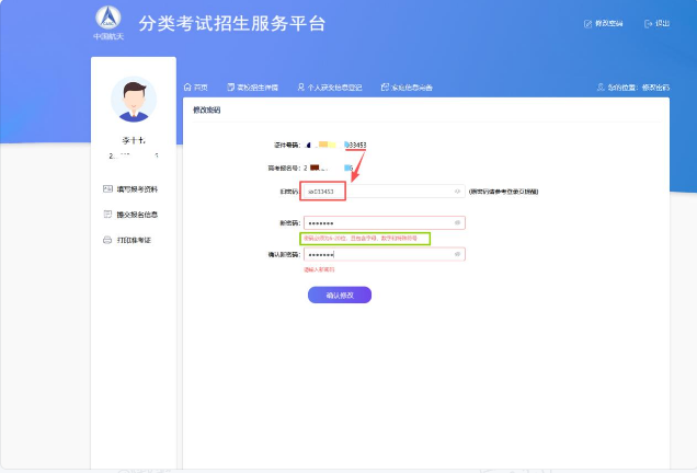 考生登录系统后,系统强制修改初始密码,考生输入初始密码及新密码后,点击“确认修改”完成初始密码修改。请务必牢记修改后的新密码,后续登录系统均用修改后的新密码登录。