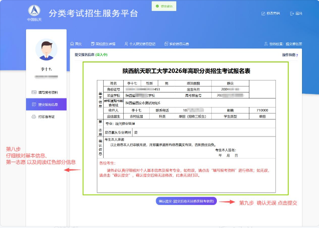 核对个人基本信息和专业志愿信息,核对无误后,点击“确认提交”,提交考生报考信息。点击“确认提交”前,可修改已填报内容,点击“确认提交”后即无法修改。