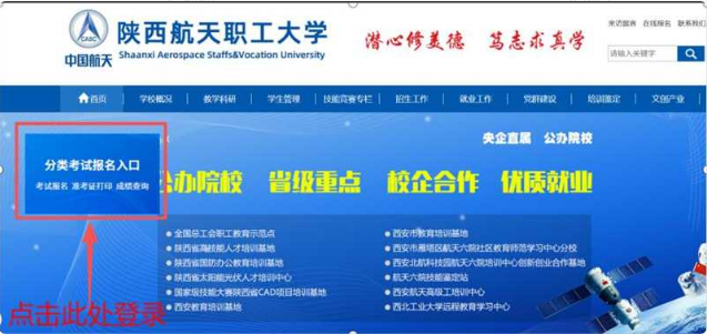 网站登录:考生登录陕西航天职工大学官网(http://htzd.xahtjx.com),点击分类考试报名入口飘窗,进入分类考试报名系统。